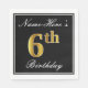 Den här enkla och elegant pappra napkin-designen innehåller ett meddelande som "Namn-här's 6e Birthday" (där "6e" har en ytliknande färg för guld) i en kvadrat med svart färgad med en enkel kontur från gräns. Namn är i en text som liknar en text med en vit färgad och kan vara personlig. Napkins som dessa kan kanske användas i en födelsedagsfest till någon som firar sin sjätte födelsedag. [~Z0000136]