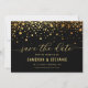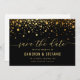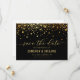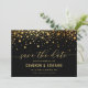 Inbjudan familj och vänner till bröllop med anpassade spara datum meddelande i elegant. Den har faux guld-foil-konetti-punkter, elegant-skript och enkel typografi. Anpassa det här svarta och det moderna guld-spara datumkortet genom att lägga till namn, datum och annan information. Den här faux guld-folien sparar datumkortet som perfekt för alla bröllop-teman eller -säsonger.