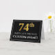 På framsidan av denna lyxiga och finare-födelsematade hälsningskortet finns ett stort ordnummer "74:e" med ett faux/imitation guld inspirerat utseende, budskapet "LYCKLIG 74:e BIRTHDAY", en mottagare av anpassade namn och en mönster i gräns som består av tunt linjer mot en svart färgad. Insidan innehåller ett anpassat hälsning-födelsedagsmeddelande eller kan kanske tas bort och lämnas tomt om ett meddelande ska skrivas för hand i stället. Ett sådant här hälsningskort för personligens födelsedag kan vara ett elegant för att ge födelsedagstjud till någon som firar sin sjuttiofjärde födelsedag. [~Z0000464]