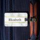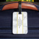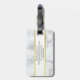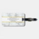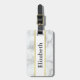 Den här bagagetaggen har en fin vit marmorbakgrund. På framsidan kan du anpassa bagagetaggen med önskad text, t.ex. din första namn (visas: Elizabeth). På baksidan anpassar du ytterligare med önskat meddelande, t.ex. fullt, adress och mobilt nummer i svart text i mitten på en vit remsa. En faux-linje (inte folie) guld är ovanför och under texten.