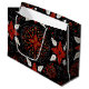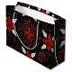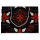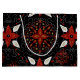 Intricate black background with a symmetrical floral pattern in red, white, and gold. Curved lines and dots add detail, creating an elegant, festive feel.