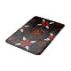 Intricate black background with a symmetrical floral pattern in red, white, and gold. Curved lines and dots add detail, creating an elegant, festive feel.
