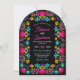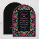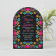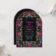 Full av färg och firande fångar denna livfulla blomsterdoftande mexikanska fiesta-båge till bröllopsinbjudan den glada känslan av en livlig fiesta. Med djärva, handmålade blommor i rika nyanser av fuchsia, tagetes, turkos och röd utstrålar denna design värme, energi och kulturell charm. Invecklade blomsterdekorationer och festlig typografi skapar en lekfull men elegant stämning, perfekt för par som planerar ett bröllop fullt av färg, musik och kärlek. Idealisk för sommarfirande, destinationbröllop eller alla som vill att deras stora dag ska börja med livlig flärd och festlig skönhet.
