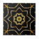 En förfinad keramisk mönsterruta som är försedd med konstnärligt arrangerade geometriska former i faux guld, som på ett lämpligt sätt kompletteras med mousserande accenter, som alla ställs mot en djup svart bakgrund.