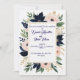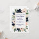 Den här designen visar en vacker blommigt gräns som skulle vara perfekt för en bröllopsinbjudan. Den har en kombination av elegant och blåa blommor och rosa ros som är uppbyggd kring ett rektangulärt gyllene ram. Sammansättningen kompletteras med sage grönt löv och delikat golden sprit eller bär som skapar ett sofistikerat och romantiskt estetiskt. Färg-paletten med marinblå, rosa, sage grönt och guld skapar en modern men tidlös kombination som är mycket populär för contemporary bröllop. Det vita utrymmet i mitten är perfekt för bröllopsinbjudningstext.