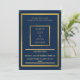 Elegant och finare marin/guld har dekorerat bröllopsinbjudan. Denna moderna utformning har ett gyllene gräns, ett guldfärgat gräns i kvadrat, där namn ingår med en genomskinlig guldblomma i bakgrunden. Närmare uppgifter om bröllop finns mellan ett guldgräns i övre grund. Dessutom är inbjudets hörn dekorerat med gyllene stjärnor.
