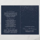 Dessa tvåfaldiga program är perfekt för alla par som planerar en romantisk firande i bröllop. Utformningen har en snyggt marin blå bakgrund med fallande stjärnor från elegant silver och motsvarande redigerbara ordalydelse. Den enkla utformningen kan vara personligen till kostym för ditt speciella evenemang och kommer att vara perfektens serviceordning för alla moderna teman party, inklusive: möhippor, förlovningar, möhippor, födelsedagsfester och mycket, mycket mer.