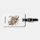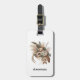 Ett bagagetagg med en söt bukett av persikofärgade blommigtar, omgiven av brunbrons- och bladbete med fjäderaccin.