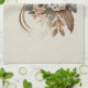 En kökshandduk med en söt bukett av persikofärgade blommigtar, omgiven av brunbrons- och bladbete med fjäderaccin. En lätt brunaktig gräddbakgrund med en svag färgad.