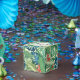Tropiska rödblommor, grönt handflatan träd och blå monstera löv tält stil är personlig med ert budskap överst - roligt för alla tillfälle. MATCHING-objekt i vår butik.