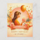 "Gör födelsedagar oförglömliga med vårt eleganta födelsedagskort med en förtjusande design med en flicka som håller en tårta mot en livfull gul-orange bakgrund. Perfekt för att sprida glädje, det är prytt med det hjärtliga meddelandet 'Grattis på födelsedagen min vän'. Skicka varma önskningar med stil!