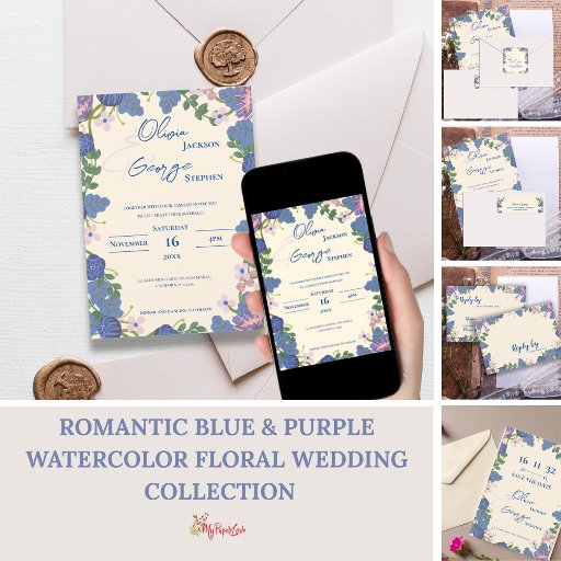 Romantic Blue & Purple Watercolor Floral WeddingDesignad av Mypaperlove Designs