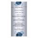Ett elegant, modernt och romantiskt menykort för bröllop. Faux silver metallisk tittar bakgrund, dekorerad med vattenfärgade blommor i blå nyanser. Mallar för namn, datum och bröllop-menyn. Svart färgad brev. Baksida: Faux silver tittar bakgrund och blommigtar.