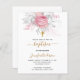 För en elegant baptism, firande av flicka. En vit chic bakgrund. Dekorerad med rosa och vita blommigtar, ro och ett faux guld kor. Anpassa och lägg till namn om barnet och detaljer. Svarta och gyllene brev.
