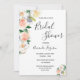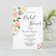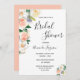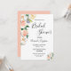 Ett trendig blommigt inbjudningskort för möhippan i vitt, korall och persika. En vit chic på framsidan. Dekorerad med stora, lush vattenfärgade blommor, blommigtar i vitt, korall och persikor. Modern stor, hanterad text, typografi med texten: Möhippa. Mallar för uppgifter om bruden och party namn. Mörk grått text. Baksida: färgad av korall.