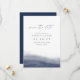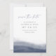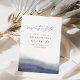 Elegantens kustnära bröllop spara datum har en ren marin blå vattenfärggradient längs grund med en graciös kurva som framkallar havsbotten och havsflödet. Dina uppgifter om bröllop visas i minimalistiska klassiska bokstäver med handskrivna skriptaccenter. Använda baksidan för att dela mer information med dina gäster.