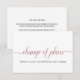 Ibland måste bröllop skjutas upp. Be dina gäster att ändra ditt bröllopsdatum med denna enkla eleganta design med orden "förändring av planer" i modern rose gold rosa skript typografi på framsidan tillsammans med ditt meddelande och namn på baksidan.