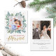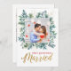 En modern, romantisk julkortsmall för nygifta med vintergrön tema, med en fantasifull fyrkantig botanisk ram av tallgrenar, silver eukalyptus och guldmyrtenkvistar (detta är en digital effekt) över fototmall på framsidan och guld folie över ordet "gifta" (detta är en digital effekt, inte riktig folie). Mall för ett andra bröllopsfoto på baksidan. Ett perfekt jul- och nyårsfirande fotokort för nygifta som är elegant och klassiskt.