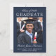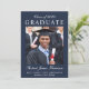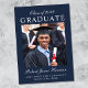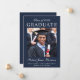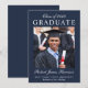 Enkel och elegant mörkblå högskoleexamen inbjudan med ett foto av examen, hans eller hennes namn och examensår i en vit script och hans eller hennes universitet, huvudämne och utmärkelser i modern vit typografi.