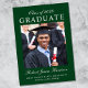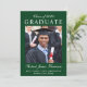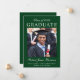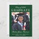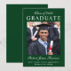 Enkel formell grön universitetsavgångsmeddelande med en bild på den examinerade studenten, hans eller hennes namn och examensår i ett elegant vitt skrivsätt och hans eller hennes universitet, huvudämne och utmärkelser i modern vit typografi.