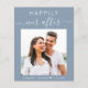 Prisvärd allt-i-ett dammblå bröllopsinbjudan med ert foto, "Happily Ever After" i en blandning av enkel vit typografi och ett elegant vitt skrivsätt med svängar, samt era förnamn och bröllopsdatum bundna samman med ett hjärta. På baksidan kan du anpassa din inbjudan med elegant vit typografi och ange din bröllopswebbadress för att skapa en QR-kod så att dina gäster kan skanna för att svara online och få ytterligare bröllopsinformation såsom boende och vägbeskrivning. Detta budget semi-glansiga papper har liknande vikt som fotopapper. Traditionella tyngre kartongversioner finns också tillgängliga (skicka oss ett meddelande för länken).