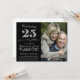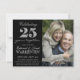 En mycket snygg, djärv svart, vit och grå "silver" färgad design som fungerar bra med svart och vit eller färg fotografi av det gifta paret som firar en viktig tjugofemårsdag. Bjud in familj och vänner till en speciell fest. Designen har klassiska falska glittereffekt siffror 2 och 5 och fin skrivstil med svängar och lockar, bredvid ett stort fotoområde som ser ut att vara insvept i ett vackert falskt silverglitterband. Anpassa dina fotobildstorlekar och beskärning efter behov, och justera bandet om det behövs genom att klicka på knappen Anpassa. Exempelbilden är endast för illustrativa syften - byt ut den mot ditt eget fotografi. Observera att alla dekorationer endast är digitala, detta är en platt tryckt produkt och det finns inga riktiga band