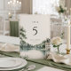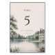 Ett elegant fransk château-inspirerat bröllopsbordskort med ett raffinerat bordnummer, parnamn och bröllopsdatum. Designat med en mjuk romantisk landskapsbild och minimalistisk typografi, ger det en tidlös och sofistikerad touch till era mottagningsbord. Perfekt för klassiska, trädgårds- eller franska landstilsbröllop.