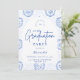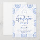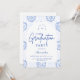 En elegant examensfirande design med en delikat blå toile blommig ram inspirerad av klassiskt europeiskt porslin och vintage botaniska tryck. De invecklade blommorna ramar in en ren välvd mittpanel och skapar en förfinad och tidlös komposition som framhäver examenens namn och evenemangsinformation på ett vackert sätt. Mjuka blå nyanser mot en skarp elfenbensvit bakgrund ger designen en sofistikerad men firande känsla. Perfekt för en stilfull examensfest med en klassisk, romantisk estetik.