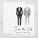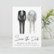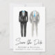 Elegant och chic ingen bild gay män bröllop rädda datum meddelande med två grå och svarta smoking akvareller med blåa accenter och "Spara datum" i ett stilfullt manus. Lägg till dina namn, bröllopsdatum och plats i modern typografi.