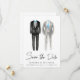 Elegant och chic ingen bild gay män vigsel spara datum meddelande med två grå och svarta smoking vattenfärg med blåa accenter och "Spara datum" i ett stilfullt skript. Lägg till era namn, bröllopsdatum och plats i modern typografi.