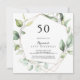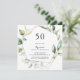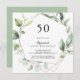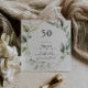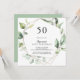 Denna eleganta geometriska guldfärgade gröna 50-års inbjudan är perfekt för en modern födelsedagsfest. Designen har handmålade botaniska gröna eukalyptusblad som pryder en guldfärgad geometrisk ram.