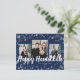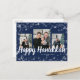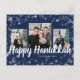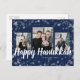 Elegant Glad Hanukkah Postkort. Detta eleganta vykort har en festlig ramöverläggning av vita snöflingor med vit text på en marinblå bakgrund med en fotokollage av 3 bilder. Baksidan innehåller en 4:e bild och ytterligare text för anpassning.