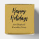 Anpassa dina företagspresentationer i chicen med det här kursiva skript som används i elegant guld under en bild av julprydnader. Elegantens typografi på den moderna förinställningsrutan för svarta partier ger anpassningsbar affärsföretag Julklapp en klassinramning. Anpassa den här presenten till ditt företag namn.
