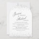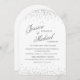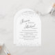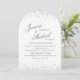 Arch-formad bröllopsinbjudan i vitt med silver glitter och ett elegant-kalligrafi/skriptteckensnitt.