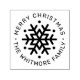Elegantens självinsugningsstam för snöflingor har en modern vit snöflinga omgiven av en rund text ram med anpassningsbar "God jul"-Julhälsningar och ett familjemonogram som kan vara personlig.