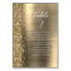 The left-hand edge of this elegant modern wedding table number card features a gold faux glitter border. The word "table" and the table number appear in white handwriting script on a gold faux brushed metal background. Add the names of your guests who are assigned to each table.