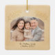 This elegant Christmas ornament has a wide arch photo template, so you can fit a favorite horizontal family photo into a stylish arch shape. Golden branches and leaves bring a special festive touch. Just below the photo, there's a template to customize the ornament with your family name and the year in script typography. The light leather print background brings a hint of luxury and a neutral background.