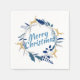 Den här eleganten har julnapkin en krans med gyllene renar och blågröna och grått-gröna renar. god jul är skrivet i ett vackert handskript.