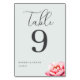 Det här bröllopsbordskortet har en minimalistisk design med en mjuk, ljusgrå bakgrund som skapar en elegant och lugn atmosfär. Layouten inkluderar ordet "Bord" i kursiv stil högst upp, följt av en stor, fet siffra "9" som fokuspunkt. En delikat rosa lotusblomma lägger till en touch av naturlig skönhet i det nedre högra hörnet och balanserar kompositionen. Anpassningsbara textfält möjliggör personalisering med namn och datum, vilket gör det perfekt för att lägga till en personlig touch på din speciella dag. Den övergripande stilen är återhållen men ändå sofistikerad, idealisk för att skapa en förfinad stämning på ditt bröllopsfirande.