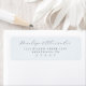 Dessa returadressetiketter har en ren och elegant design med centrerade textelement på vit bakgrund. Layouten inkluderar ett flytande kursivt skrivstil för namn och en formell serif-teckensnitt för adress och postnummer, vilket skapar ett sofistikerat utseende. Med en monokrom mörkgrå färgpalett utstrålar designen enkelhet och återhållen lyx, vilket gör den perfekt för formella tillfällen. Det generösa avståndet mellan raderna förbättrar läsbarheten samtidigt som den behåller en övergripande balanserad komposition.