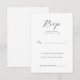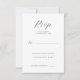 Detta eleganta bröllopssvarskort har en minimalistisk design med gott om vitt utrymme, vilket ger ett rent och sofistikerat intryck. Layouten inkluderar ett framträdande kursivt "RSVP" högst upp, följt av en formell serif-teckensnitt för instruktionerna för svaret. Personliga alternativ integreras sömlöst, vilket möjliggör tillägg av namn och antal deltagare. Den återhållna färgpaletten med mörkgrått eller svart på krispigt vitt förstärker dess klassiska stil, vilket gör det perfekt för att förmedla förfining och enkelhet på ditt speciella evenemang.