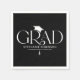 Celebrate your graduate with refined, modern style using these elegant graduation party napkins. Set against a sleek black background, the design features the word “GRAD” in a modern serif typeface, with a stylish graduation cap icon positioned above the “R.” The end of the “R” flows seamlessly into a dangling tassel that runs through the graduate’s name, school, and class year for a cohesive, high-end look.