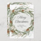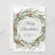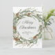 Det här fantastiska helgdag har en julkrans med botaniskt grönt löv från elegant och gräs-koner med blomvita blommor. Modern manuskalligrafi säger "God jul" och en subtil grönt vattenfärg stänk dekorerar kransens centrum. Baksidan har en matchande design med rum för att lägga till ett personligt meddelande.
