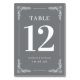 Detta eleganta bröllopsbordskort har en symmetrisk layout med en dämpad grå bakgrund, vilket ger en sofistikerad och klassisk look. Designen framhäver en stor siffra "12" i fet vit serifstil i mitten, omgiven av ömtåliga bladliknande motiv som ger en organisk touch. Anpassningsbara textfält möjliggör personalisering med namn och datum, vilket gör det perfekt för formella evenemang som bröllop. De rena linjerna och den balanserade kompositionen förmedlar en stämning av förfining och formalism, perfekt för att förstärka din speciella dags atmosfär.