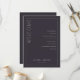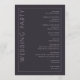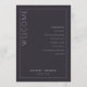 Detta eleganta bröllopsprogram har en minimalistisk design med en mörkgrå bakgrund och ren, modern typografi. Layouten är vertikal och uppdelad av en tunn vit linje som skapar två sektioner: en för den välkomnande texten "VÄLKOMMEN" i stor serif-stil och en annan som listar ceremonihändelser i en centrerad sans-serif-stil. Anpassningsbara platshållare möjliggör personalisering med namn och datum, vilket gör det perfekt för formella firanden. Det övergripande stämningen är sofistikerad och förväntansfull, perfekt för ett minnesvärt evenemang.