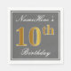 Den här enkla och elegant pappra napkin-designen innehåller ett meddelande som "Namehär's 10 Birthday" (med "10:e" som har en ytliknande guld-liknande färg) i ett fyrkantigt grått-färgad-område med en enkel gräns-kontur. Namn är i en text som liknar en text med en vit färgad och kan vara personlig. Napkins som dessa kan kanske användas i en födelsedagsfest till någon som firar sin tioårsdag. [~Z0000191]