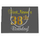 Den här enkla presentsäcksdesignen i eleganten innehåller ett personlig som "FirstName's 38th Birthday!" (med "38th" som har ett faux/imitation guld-liknande färgutseende) på en grått färgad-bakgrund. Namn är i skriptliknande gult-färgad och kan vara personlig. En sådan här personlig-födelsedagspressning skulle kanske kunna användas när en present eller gåva till någon som firar sin trettioåttonde födelsedag är ge. [~Z0000261]