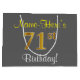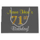 Den här enkla presentsäcksdesignen i eleganten innehåller ett personlig som "Namn-här's 71:a födelsedag!" (med "71:a" som har ett utseende som påminner om Faux/imitation guld) på en grått färgad-bakgrund. Namn är i skriptliknande gult-färgad och kan anpassas. En sådan här personlig-födelsedagspressning skulle kanske kunna användas när en present eller gåva till någon som firar sin sjuttioförsta födelsedag är ge. [~Z0000261]