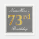 Den här enkla och elegant pappra napkin-designen innehåller ett meddelande som "Namehär's 73 Birthday" (med "73:e" som har en faux-guld-liknande färgning) i ett fyrkantigt område med grått-färgad som har en enkel gräns-kontur. Namn är i en text som liknar en text med en vit färgad och kan vara personlig. Napkins som dessa kan kanske användas i en födelsedagsfest till någon som firar sin sjuttiotredje födelsedag. [~Z0000191]