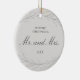 Gifte du dig i år? Lägg till ett minne i träd med denna viktiga keramiska prydnadsprodukt med två enkla hand plockade-blyertspennor som skissas med löv med ord, "Vår första jul som Mr och Mrs" tillsammans med ert bröllop över en neutralt grått bakgrund. Lägg till ditt favoritfoto på baksidan. Detta prydnadsföremål ger också en underbar gåva till ett nygift par inför deras första jul.